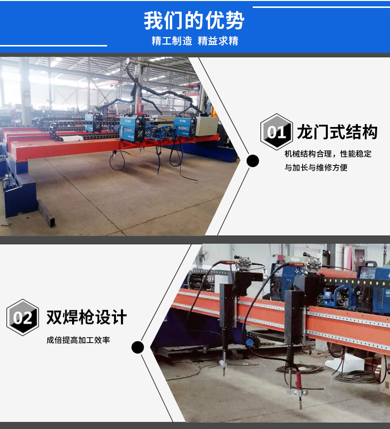 獨創的龍門式結構;機械結構合理,性能穩定與加長與維修方便;雙焊設計;成倍提高加工效率;兩套四件式定型模板設計;有效保證焊接精度與實現了機器不停的循環式加工模式;再次成倍提高了加工效率。公司開發的焊接機器人專用手持示教系統:操作簡單,功能強大。