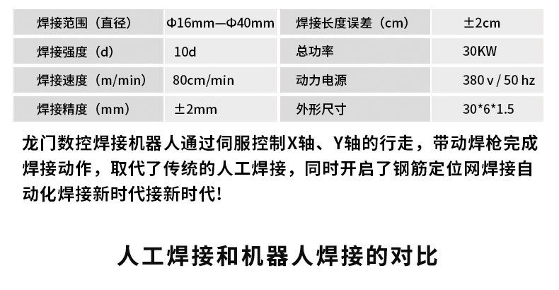隨著我國經濟的迅速發展,生產周期在不斷地縮短,焊接自動化、焊接質量要求不斷地提高,使得數控鋼筋加工裝備替代傳統手工加工及半自動機械加工鋼筋成為必然趨勢。到目前為止,國內蓋梁骨架片焊接工作90%以上都是由人工焊接完成。存在效率低下,質量不可控,工人勞動強度高與身體傷害嚴重。公司在這樣的市場環境下研發出國內一臺龍門式蓋梁骨架片焊接機器人,同時開啟了蓋梁鋼筋骨架片自動化焊接新時代!